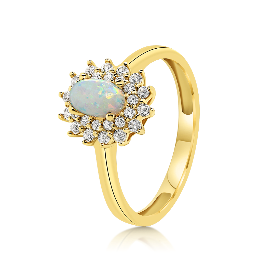 Inel din aur galben de 14K, cu piatră centrală Opal și pietre Cubic Zirconia albe.