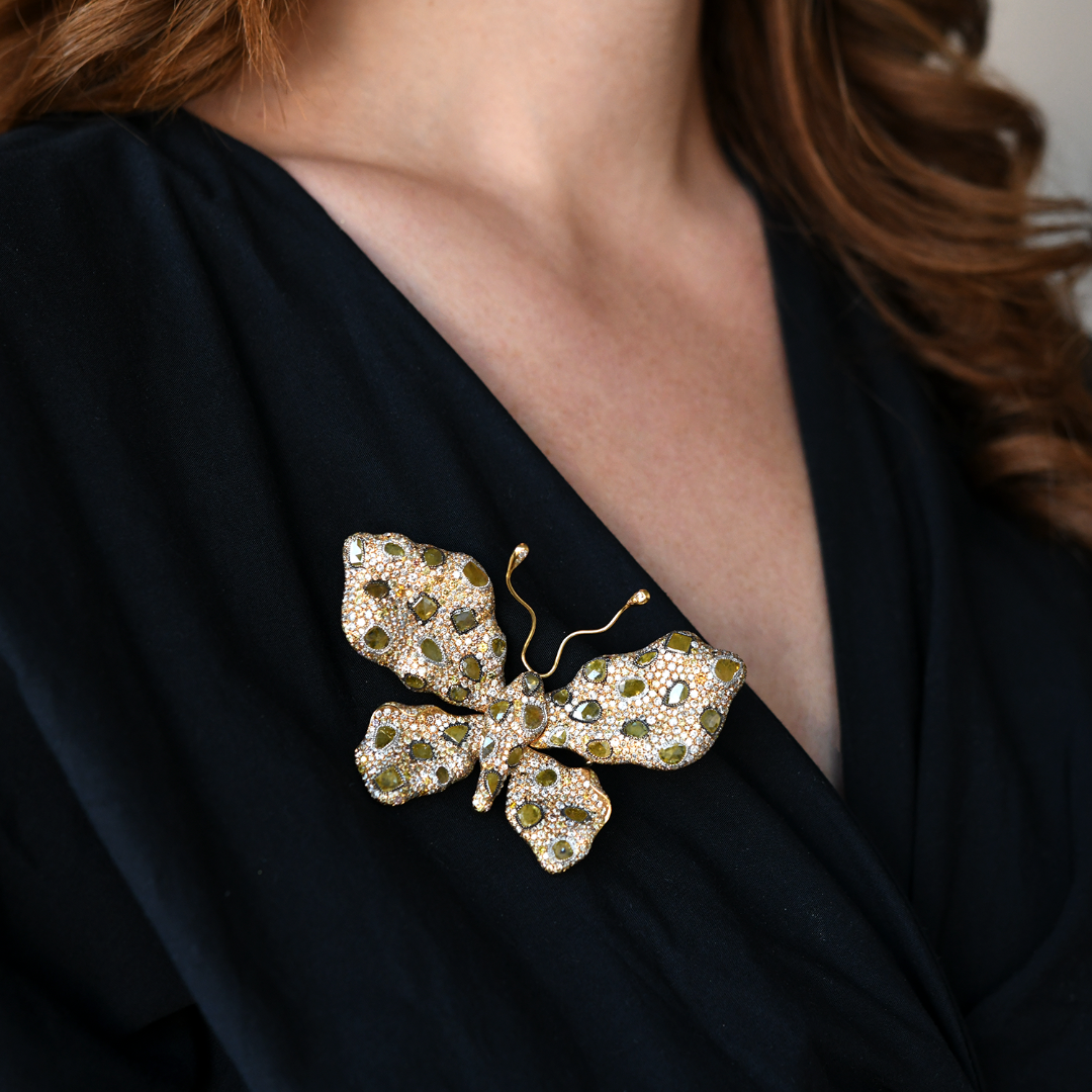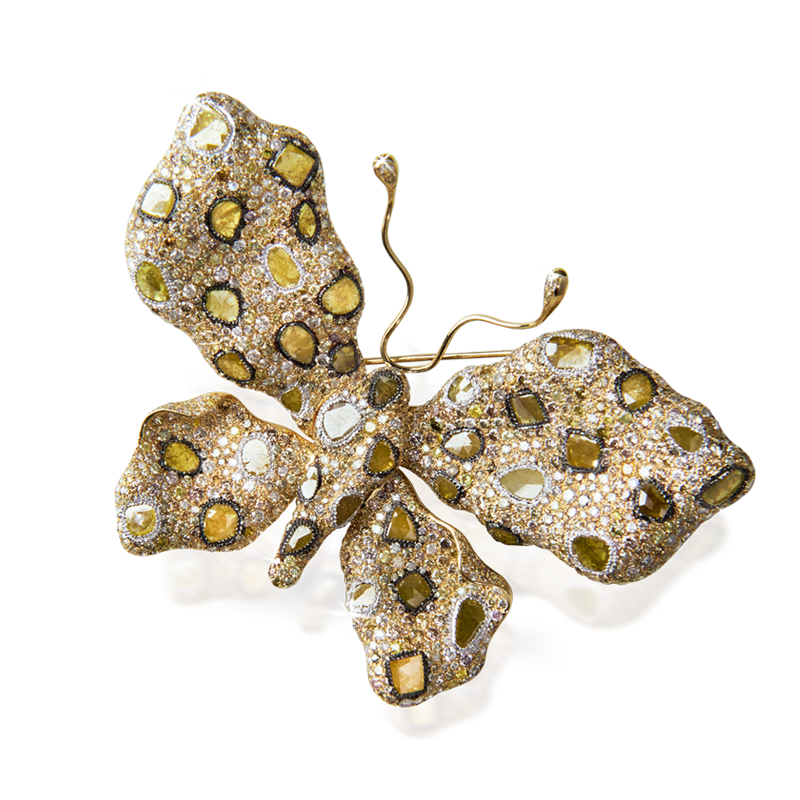 Broșă în formă de fluture din aur galben de 18K, încrustată cu 365 de Diamante incolore de 2.12ct. și 689 Diamante colorate cu o greutate totală de 11.28ct.