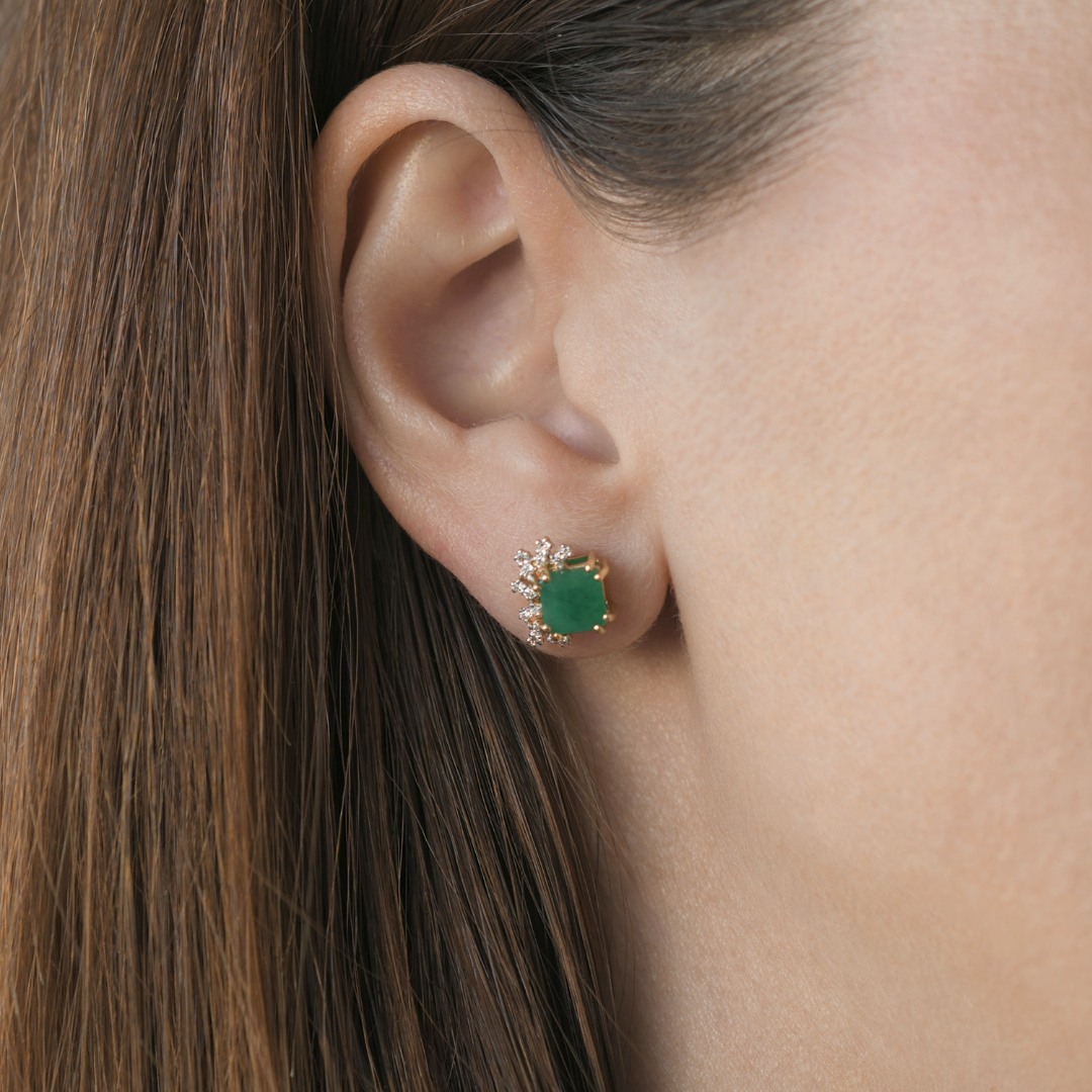 Cercei din aur galben de 18K, încrustați cu două Smaralde și Diamante naturale Brilliant cut.