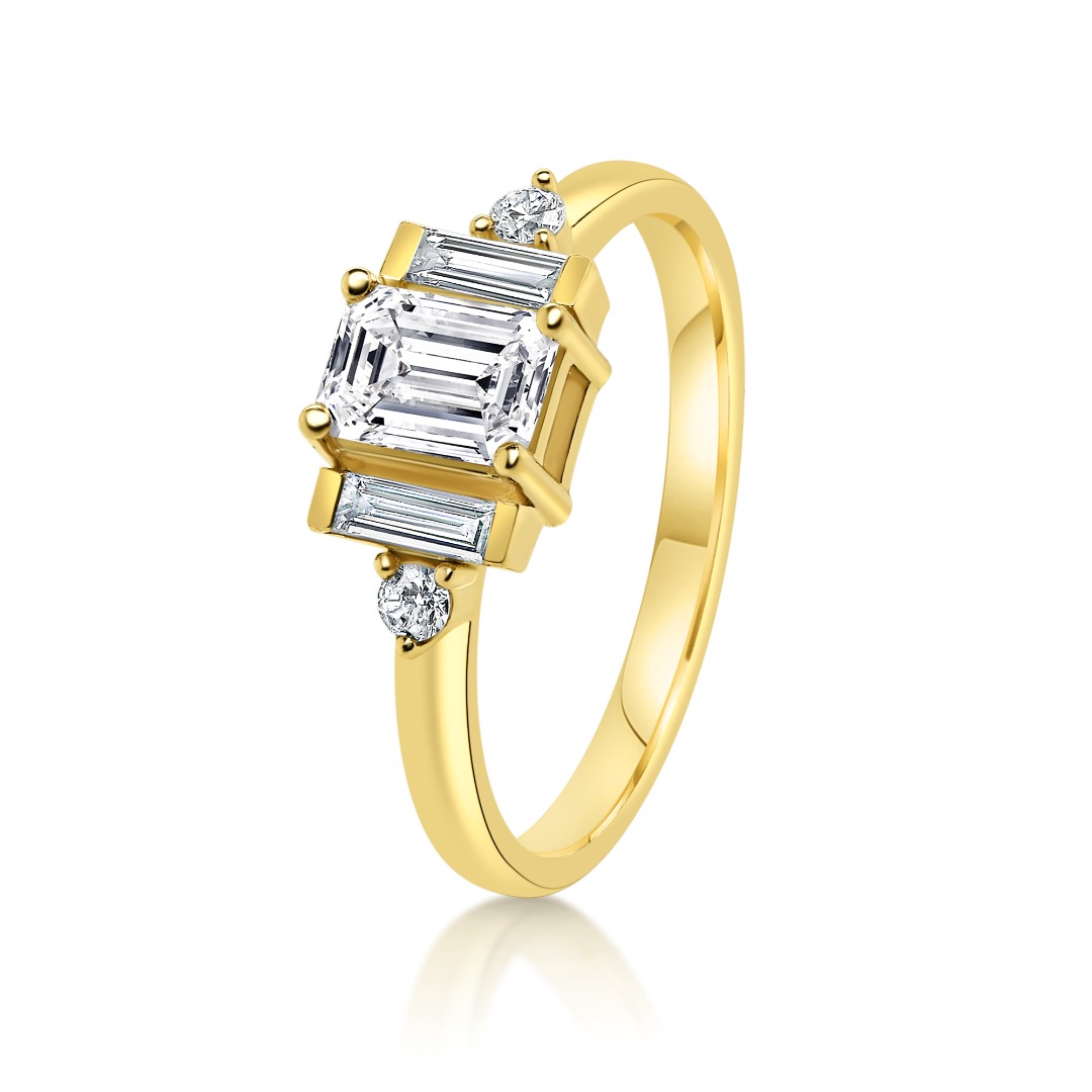 Inel din aur galben de 18K, încrustat central cu două Diamante Baguette și un Diamant Emerald cu o greutate de 0.61ct și două Diamante laterale Round Brilliant de 0.14ct.