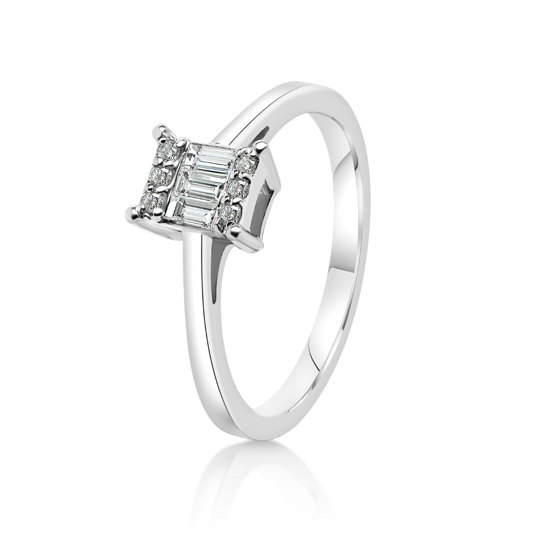 Inel din aur alb de 18K, încrustat cu 3 Diamante Baguette de 0.06ct și 6 Diamante Round Brilliant de 0.16ct.